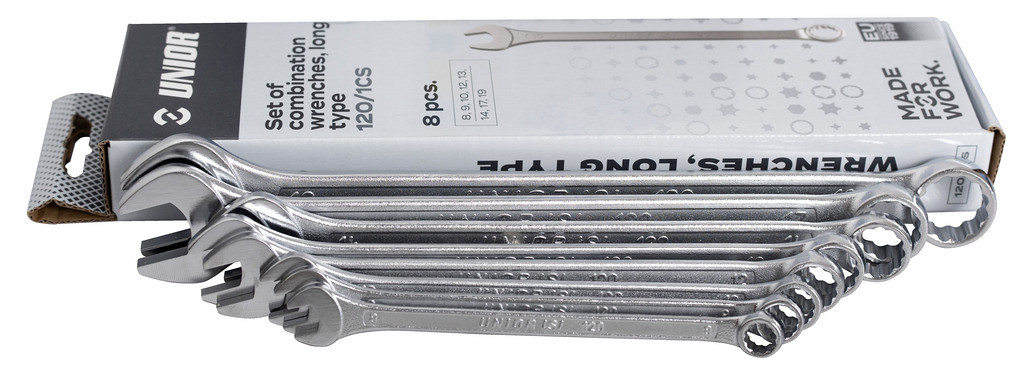 • Set vsebuje: 8x dolgi viličasto obročni ključ (artikel 120/1) dim. 8, 9, 10, 12, 13, 14, 17, 19