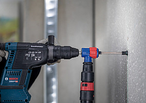 • Vrtanje v armirani beton z naprednim odstranjevanjem prahu! Monterji in gradbeni delavci predobro vedo, da pri vrtanju v beton nastajajo velike količine prahu. Delo je zlasti neprijetno, če moraš vrtati nad glavo ali izvrtati in očistiti vrsto lukenj za kemična ali mehanska sidra. Sveder EXPERT SDS Clean plus-8X smo zasnovali za takšna zahtevnejša dela. Ker hkrati vrta in odstranjuje prah in delce, ti pomaga odpraviti utrujajoče čiščenje. EXPERT SDS Clean plus-8X ti pomaga odstraniti prah pri vrtanju nad glavo ali vrtanju vrste lukenj za mehanska in kemična sidra. Sveder ima karbidno glavo s štirimi rezili in notranji odsesovalni kanal. Deluje s priključkom SDS Clean plus, ki je primeren za vse svedre SDS Clean plus-8X in ga je enostavno namestiti in odstraniti. Sveder se s pomočjo priključka priključi na odsesovalnike prahu, da omogoči odsesavanje prahu in majhnih delcev betona iz luknje skozi vgrajeni odsesovalni kanal. Vgrajeni pokrov proti prahu pomaga pri zbiranju delcev in prahu, ki nastane, ko začneš z vrtanjem.